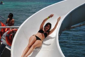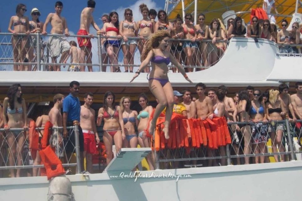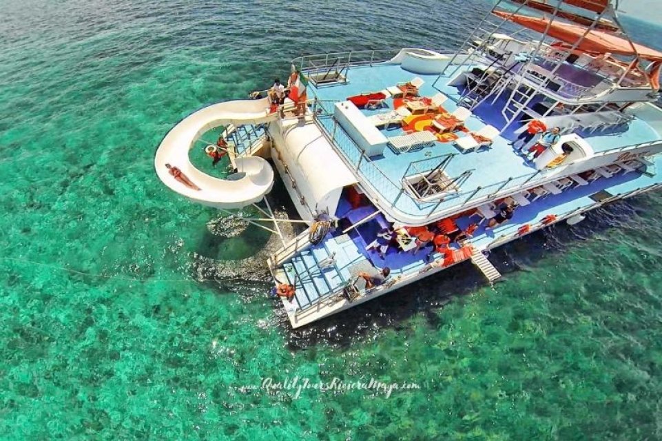 Embárcate en el Catamarán Dancer para un día de diversión total en el Caribe. Navega hacia Isla Mujeres con barra libre y comida a la parrilla. Disfruta de snorkel, saltos desde el trampolín y deslizamientos por el tobogán. Explora Isla Mujeres, relájate en el mar y disfruta de una fiesta de regreso a Cancún